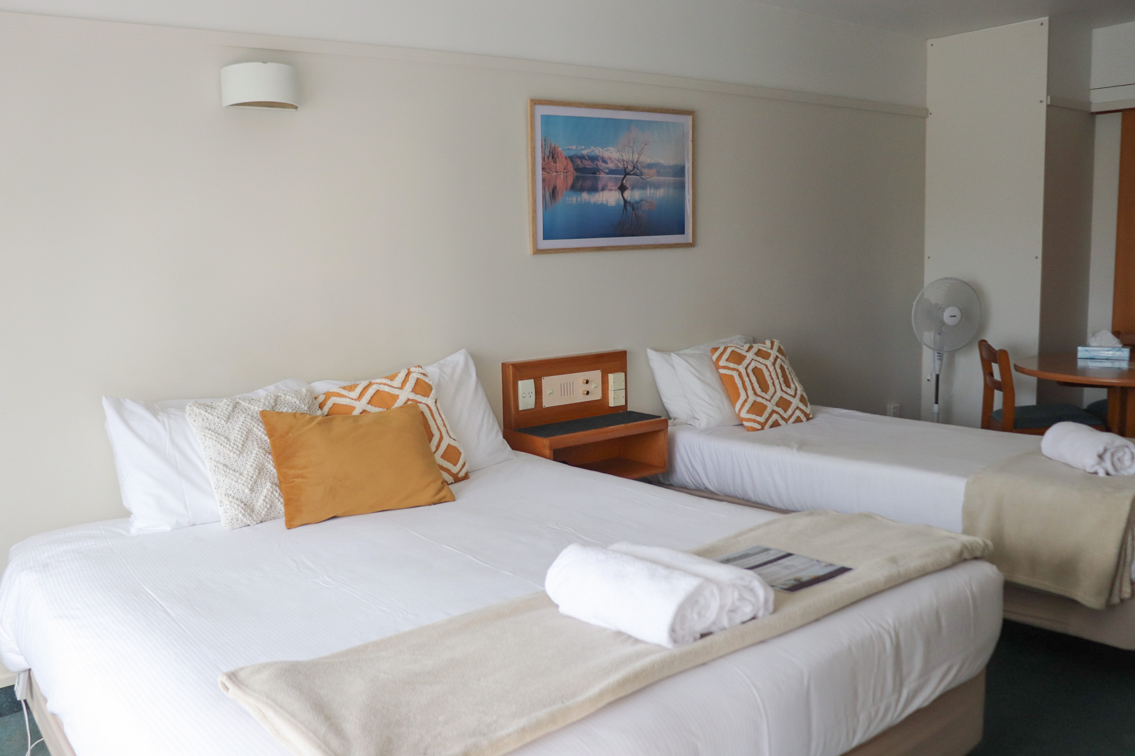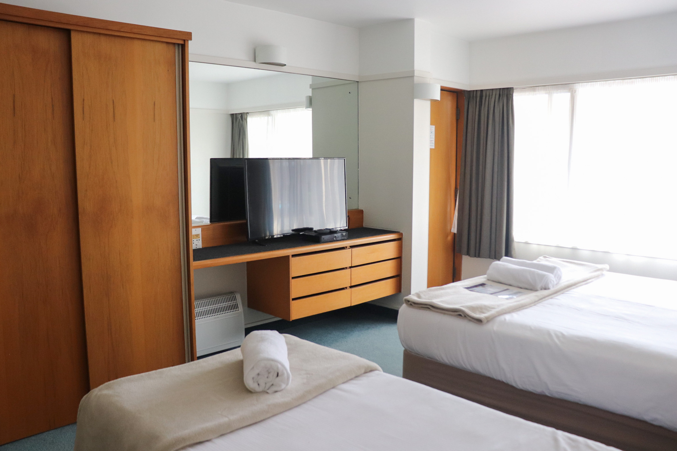 Each room features a king bed and a single bed, a flat-screen TV with Sky channels, a dining table, and a private ensuite bathroom with a walk-in shower.